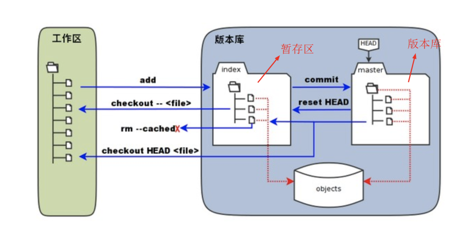 工作库、暂存库、版本库- 工作库:项目目录文件